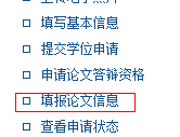 在学院已经成功报送了论文答辩成绩的前提下,学员在等待一个工作日后即可进行填报论文信息操作位置为操作浏览器左侧,如下图红框所示