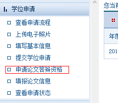 同时请以上院系通知14年1月授予学位的同等学力学员(名单见附件“14年1月同等学力名单.xls”) 进入学生本人系统进行“申请论文答辩资格”位置为操作浏览器左侧,如下图红框所示