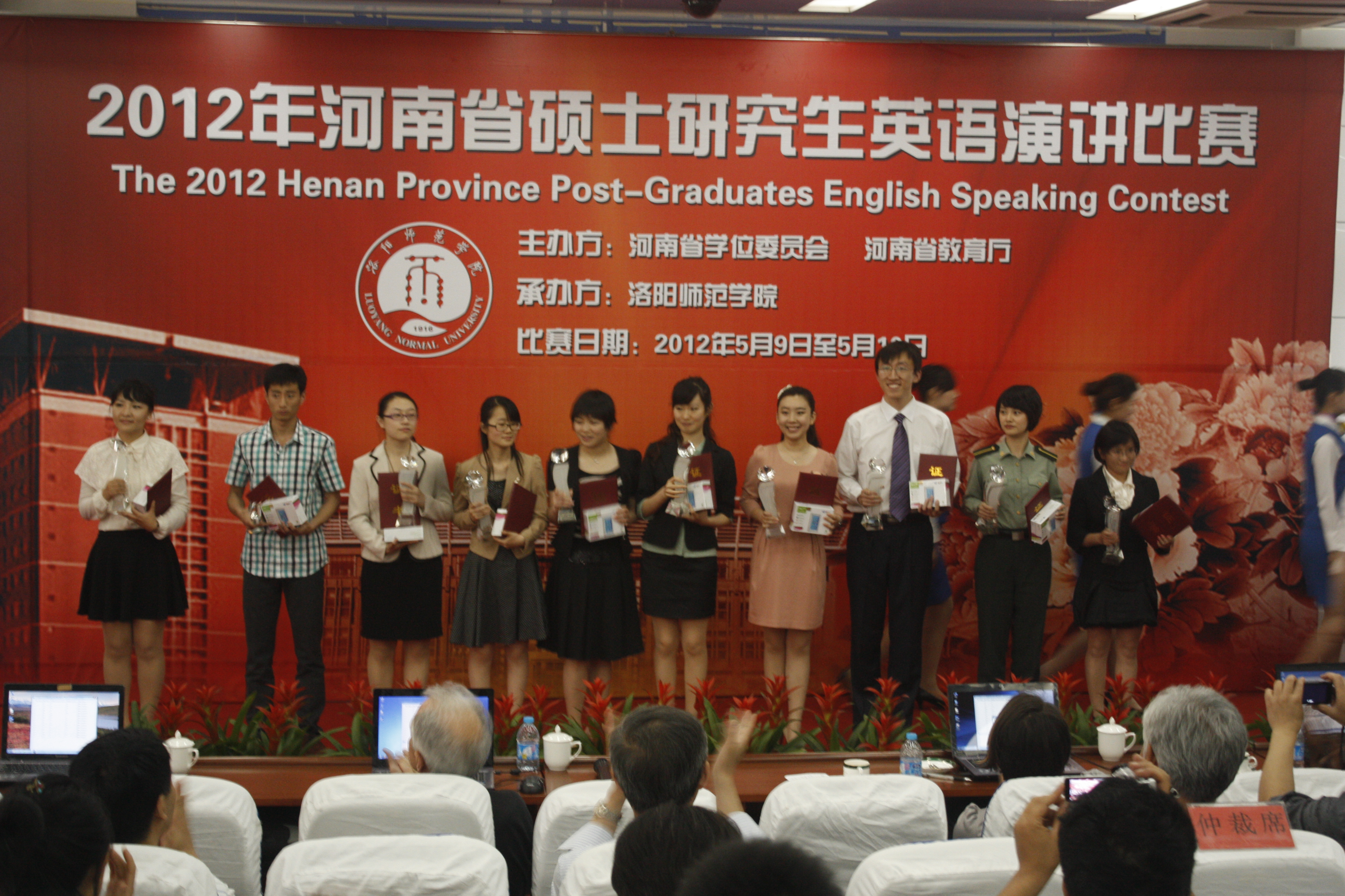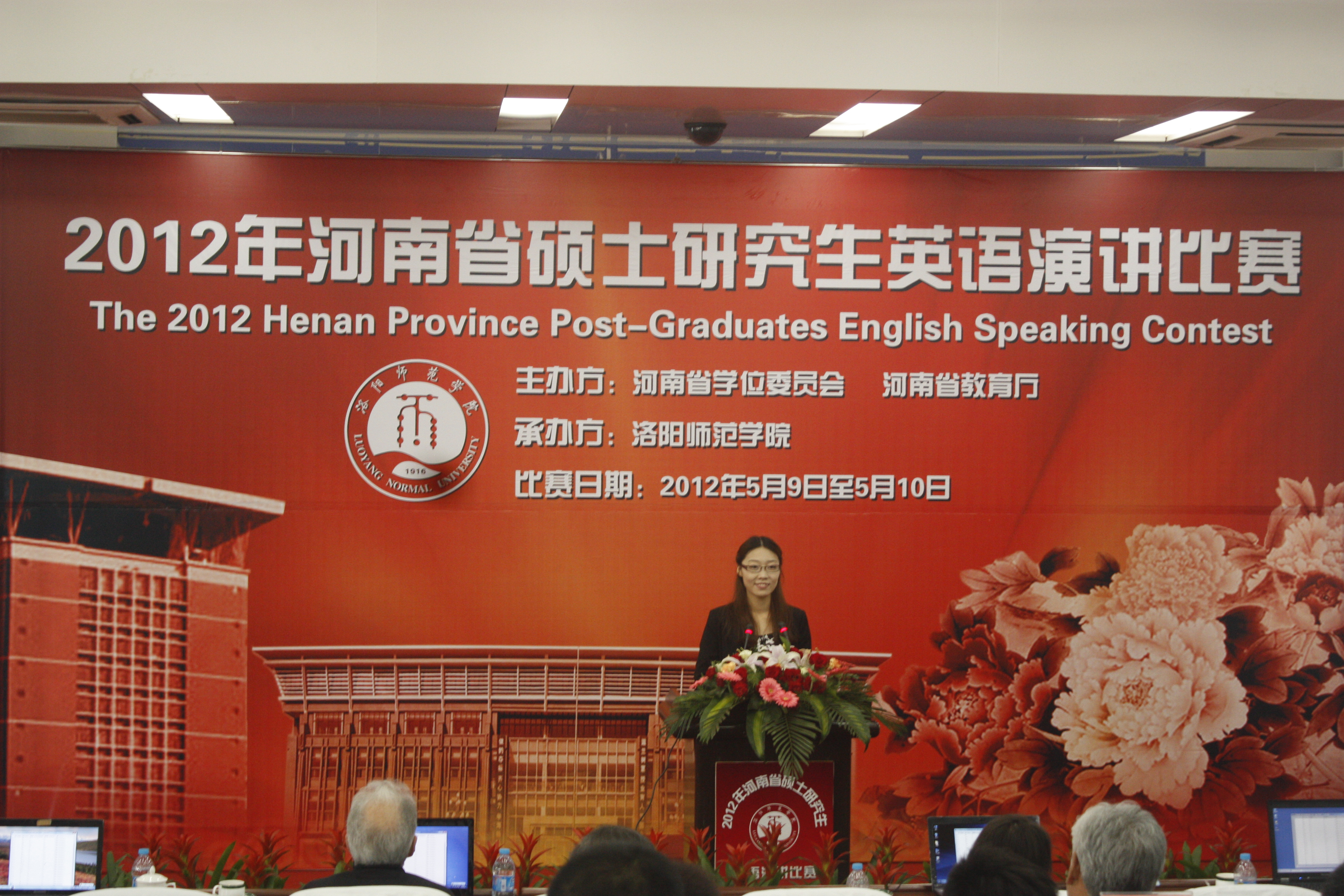 2012年河南省硕士研究生英语演讲比赛于5月9日—10日在洛阳师范学院举行。本次比赛由河南省学位委员会、河南省教育厅主办,共有来自我省17所研究生培养单位的高校、74名非英语专业的硕士研究生参加。776net必赢官网9名参赛选手全部获奖,其中新闻与传播学院王丽、公共管理学院高宁泽等2人获二等奖;管理工程系邱珂、新闻与传播学院王素娅、第一临床学院秦爽、公共管理学院王德龙等4人获三等奖;新闻与传播学院郭晨、教育系宋得龙、公共管理学院陈玄等3人获优秀奖。